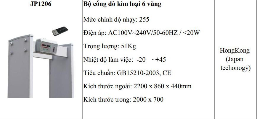 Cổng Dò Kim Loại JP1206 là một dòng Cổng dò kim loại có giá thành vừa phải, hợp lý nhưng có các tính năng mạnh mẽ trong việc phát hiện ra các loại kim loại như vũ khí trong khi các vật dụng cá nhân như chìa khóa, tiền xu, thắt lưng và kính mắt có thể đi qua mà không gây ra một báo động nào.