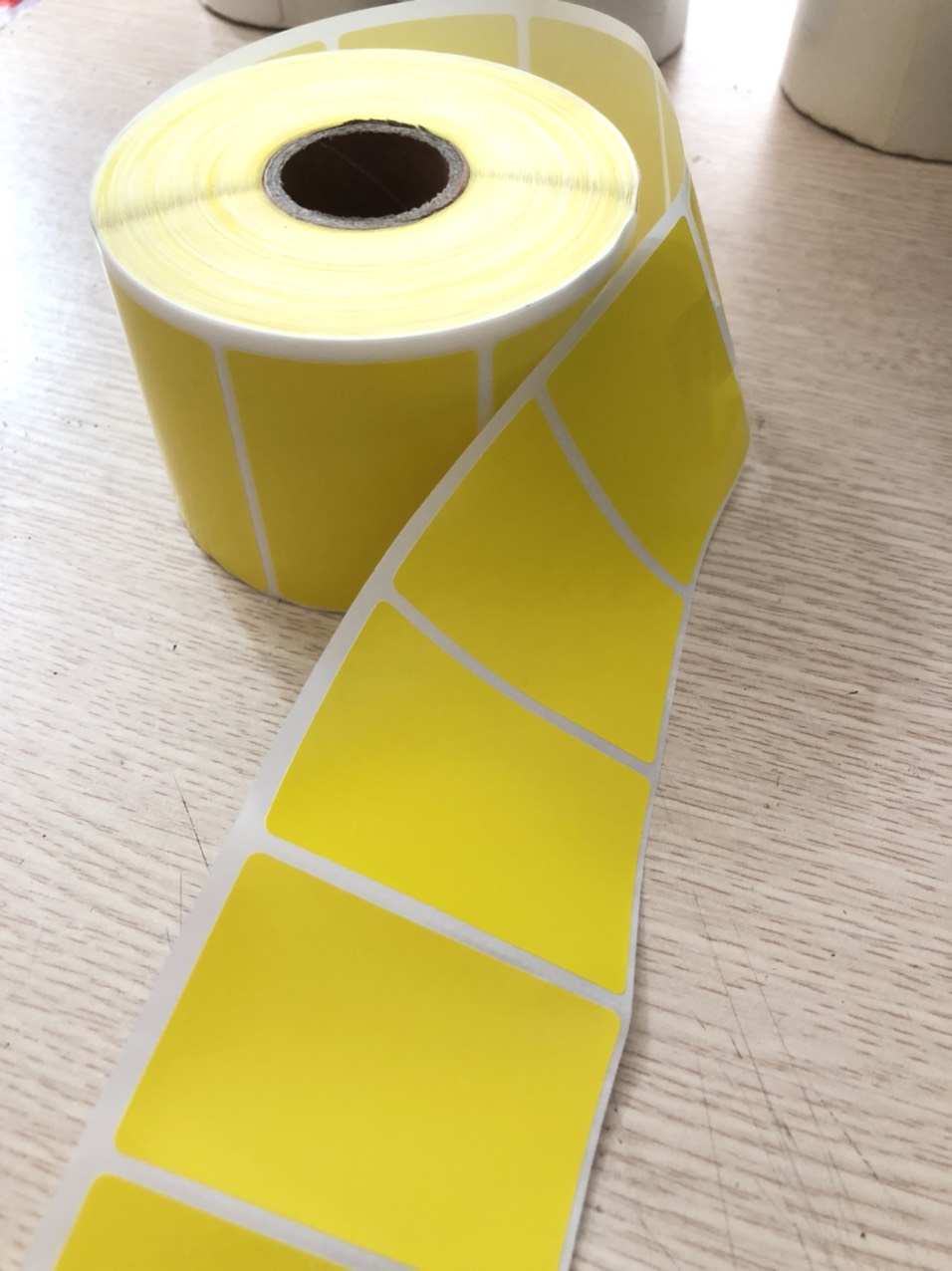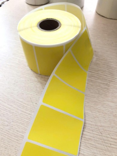 Decal nhiệt 60x40mm cuộn 30m phủ màu vàng, in bằng máy nhiệt